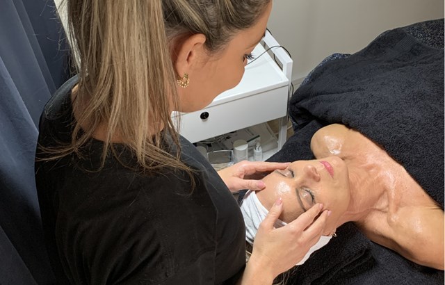 Selvforkælelse skal der til! Her er Anna i gang med at lave en ansigtsbehandling på Tina (Foto: Choice og Beauty)