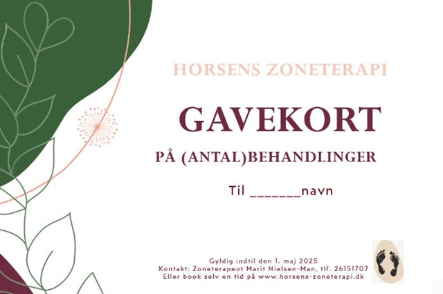 Giv et gavekort til behandling med zoneterapi til en, du holder af: Ring eller send en sms til 26 15 17 07 eller via e-mail på kontakt@horsens-zoneterapi.dk. Husk at skrive navnet på modtageren af gavekortet. Gavekortet kommer i din mail dagen efter henvendelsen