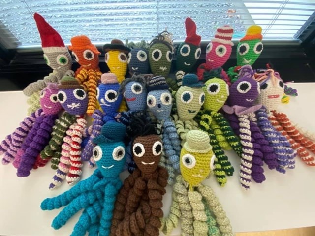 Her ses et udpluk af de mange fine blæksprutter, som Janni har hæklet og doneret til regionshospitalet i Horsens. (Foto: Janni Høgh)