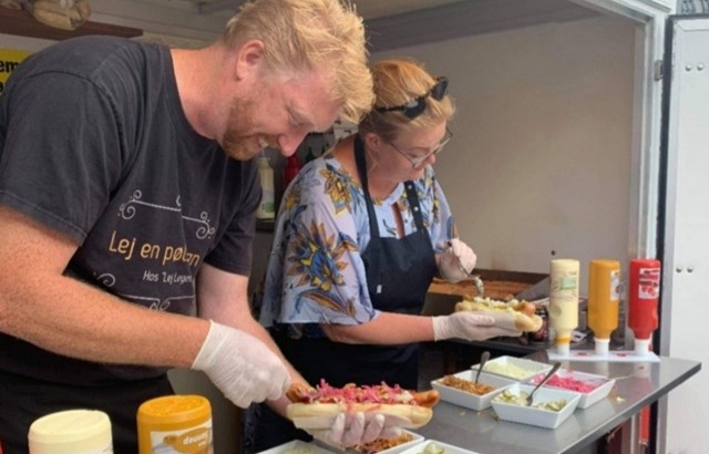 Foto: Privat // Maja og Mathias i fuld sving i en af pølsevognene.