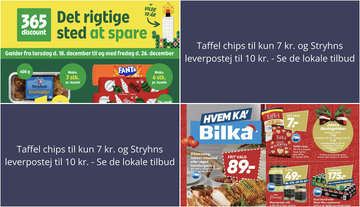 Bilka tilbyder Taffel chips i varianterne snack hjul, hjerter eller sticks til kun 7 kr. pr. pose. Vægten varierer mellem 110-175 g, og tilbuddet gælder fra fredag d. 19. december til onsdag d. 24. december.